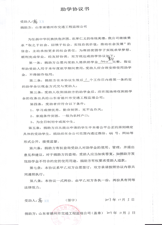 在此基礎(chǔ)上,我們認(rèn)為公司還能做得更好更多,優(yōu)秀企業(yè)對社會的信譽(yù)不應(yīng)該停留在提供關(guān)注本身的層面上,而應(yīng)該通過承擔(dān)更多的社會責(zé)任、幫助需要的社會群體實(shí)現(xiàn)公司更大價(jià)值,也為員工自我價(jià)值的提升提供一個(gè)平臺。樂善好施、扶貧幫困是中華民族的傳統(tǒng)美德;相互幫助、患難扶持是社會倡導(dǎo)的時(shí)代新風(fēng)。它既體現(xiàn)了人類最高尚的品質(zhì)、最美好的情感和道德情操,又是社會文明與進(jìn)步的標(biāo)志。帶著對這一份理解,監(jiān)理公司決定在全公司范圍內(nèi)發(fā)起倡議,用我們的愛心,竭盡全力圓新生力量的“讀書夢”。我們將為條件家庭困難的莘莘學(xué)子提供讀書條件,幫助他們順利完成學(xué)業(yè)。