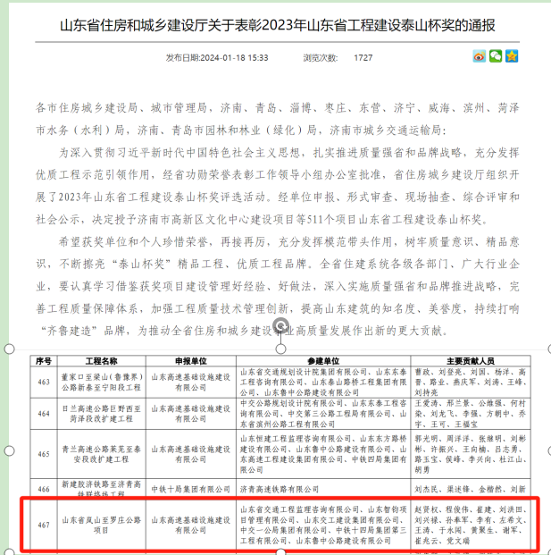 嵐羅高速項(xiàng)目榮獲2023年度“山東省工程建設(shè)泰山杯獎(jiǎng)”